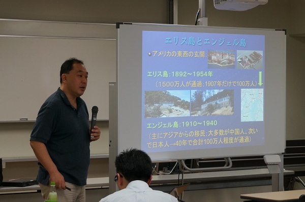 続いて、神戸大学大学院法学研究科簑原俊洋教授は「戦前の日本人移民問題と現在の欧州の難民問題:果たして同化は可能か?」というタイトルで、米国での排日運動の歴史とEUや日本の移民政策について講演し、今後どうするべきかについて新しい世代となる生徒たちに問いかけました。