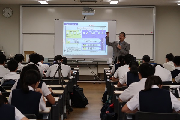附属中等教育学校勝山元照副校長に開会のご挨拶をいただいた後、神戸大学大学院経済学研究科吉井昌彦教授が「欧州連合とは何か:歴史・仕組みとBrexit後の課題」というタイトルでEUの統合を詳しく説明された上で、現在EUが抱える課題、主に英国のEU離脱であるBrexitについてお話されました。そして、離脱の背景及び離脱のプロセスについて説明されたのち、EUの将来として考えられる5つのシナリオを紹介されました。